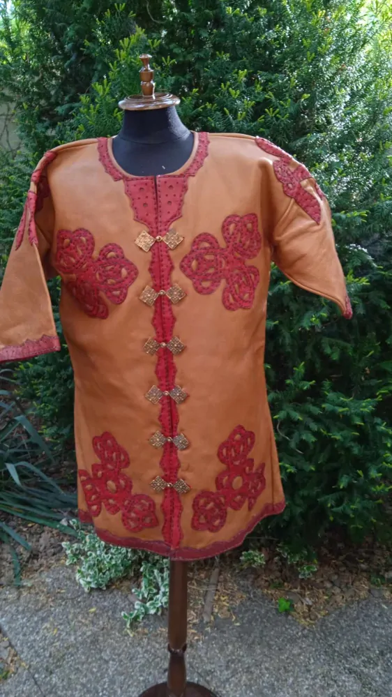 Kožený kaftan zdobený ručně našitou červenou kůží.