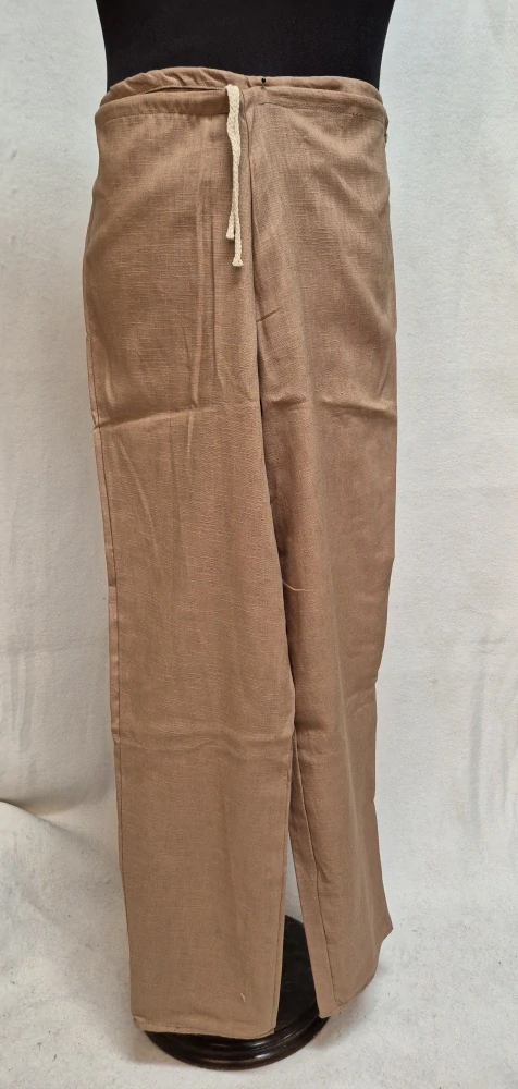Kalhoty jsou šité z příjemného béžového lnu. V pase mají bavlněný provázek.