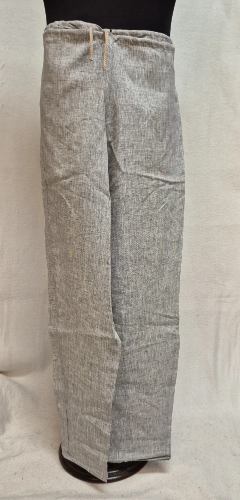 Kalhoty jsou šité z příjemného lnu v barevnosti černo-bílá melanž. V pase mají bavlněný provázek.