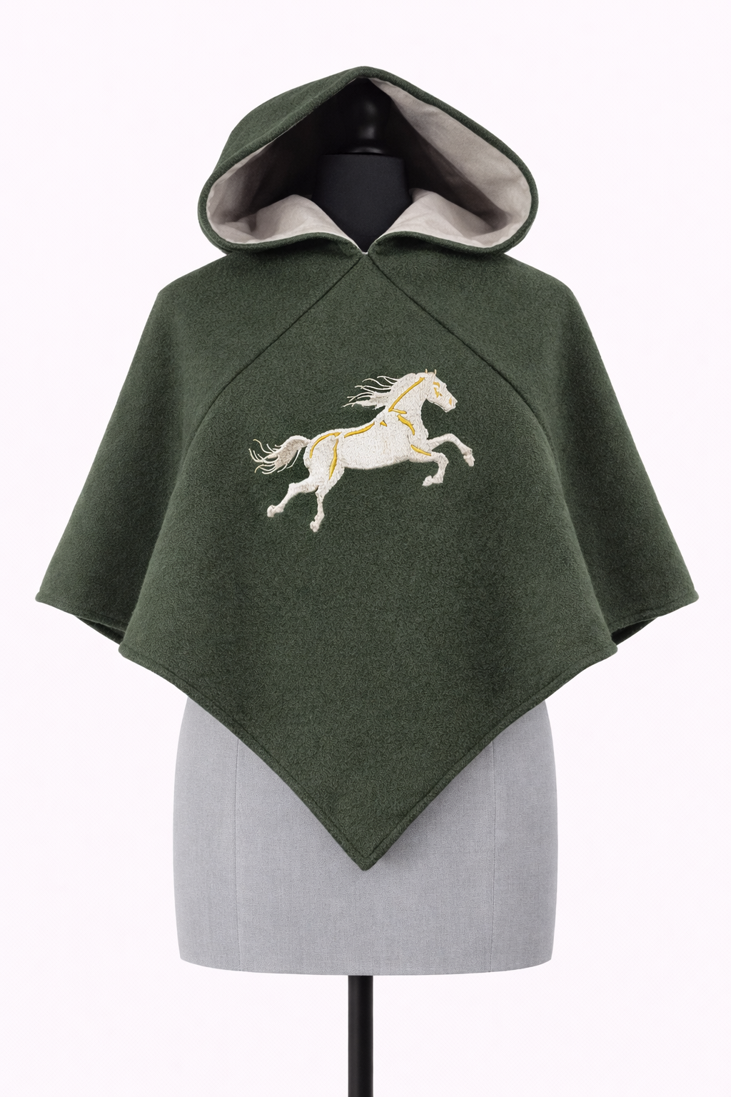 Kapuce zdobená strojovou výšivkou bílého rohanského koně.