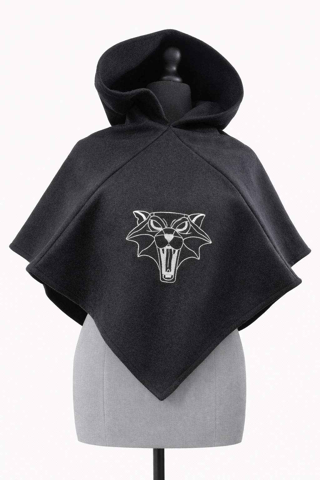 Černá kapuce s výšivkou inspirovanou školou kočky světle šedou nití.