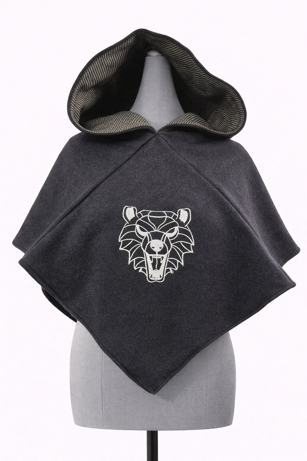 Černá kapuce s výšivkou inspirovanou školou medvěda světle šedou nití.