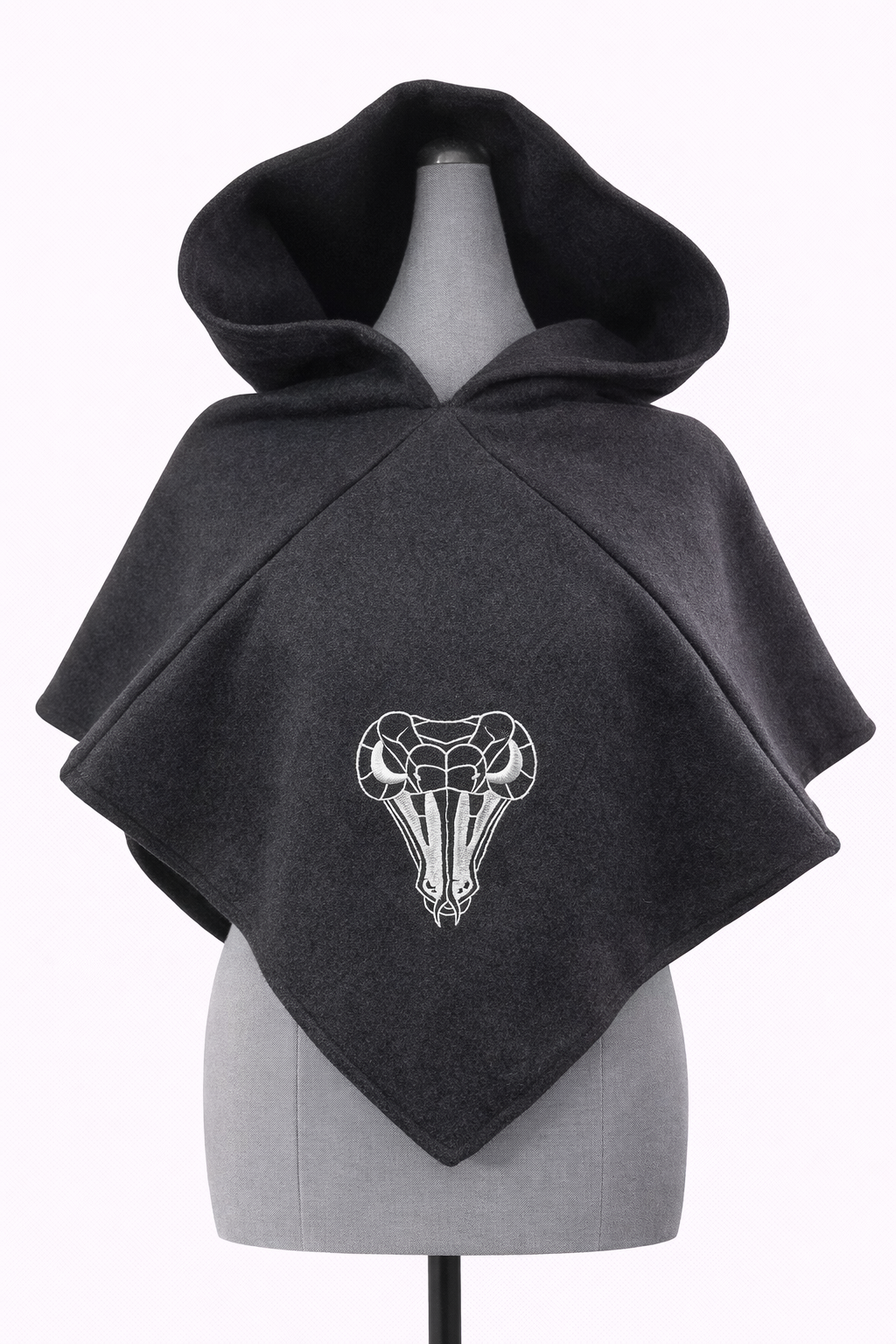Černá kapuce s výšivkou inspirovanou školou zmije světle šedou nití.