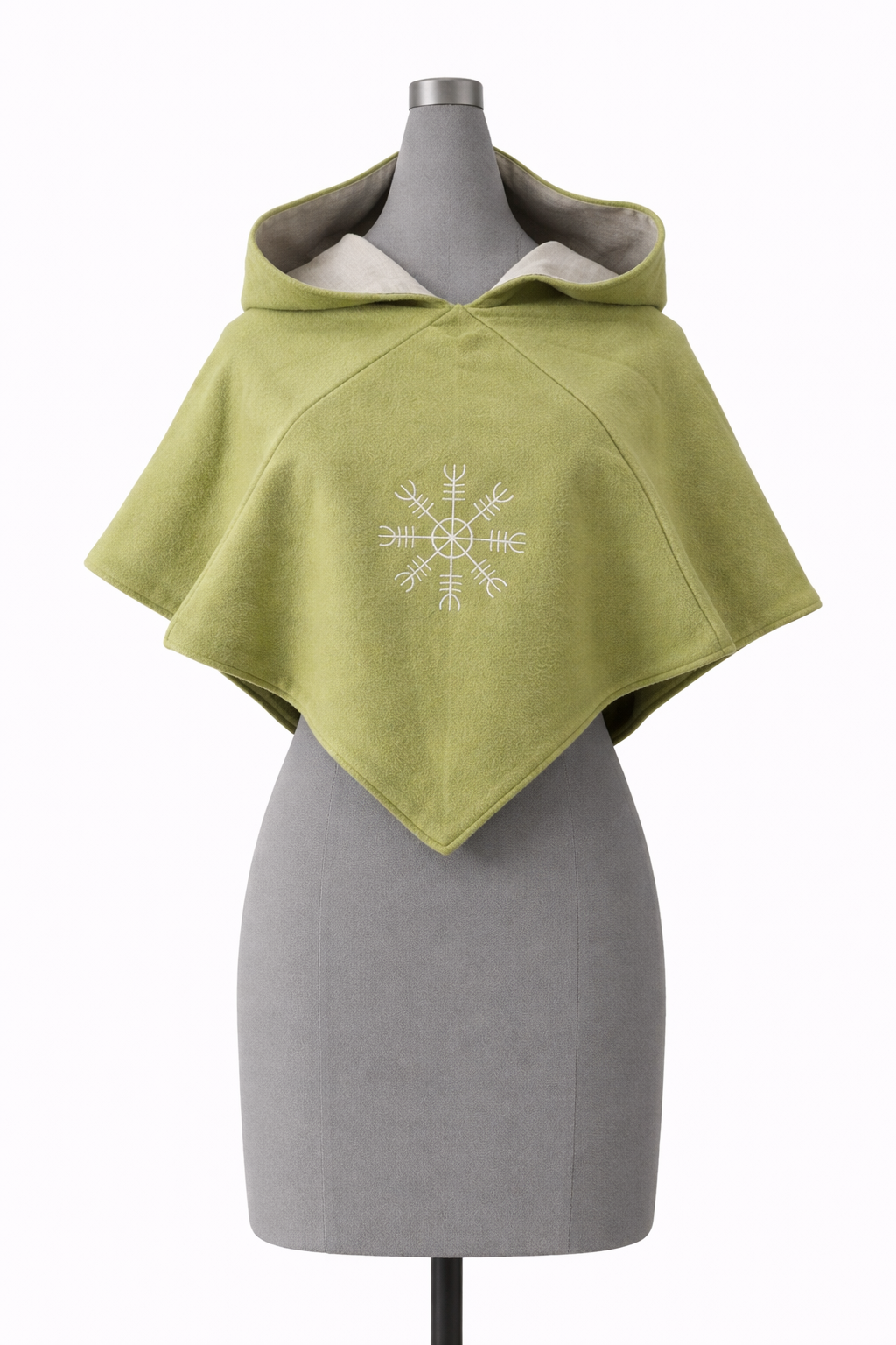 Vrchní vrstva je světle zelená vlna, podšívka len v přírodní barvě. Kapuce má výšívku symbolu kompasu béžovou nití.
