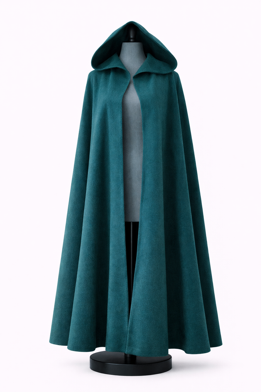Půlkruhový plášť z pertolejového vlněného kepru s kapucí.