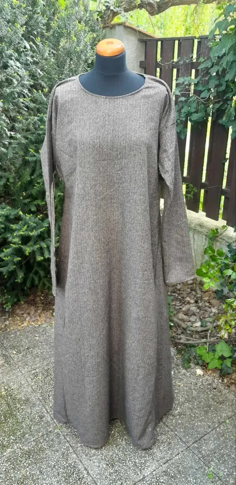 Šaty z tenké vlny v barevnosti béžová-antracit melanž. Vlna může být pro někoho kousavá a proto doporučujeme nosit na spodních lněných šatech.