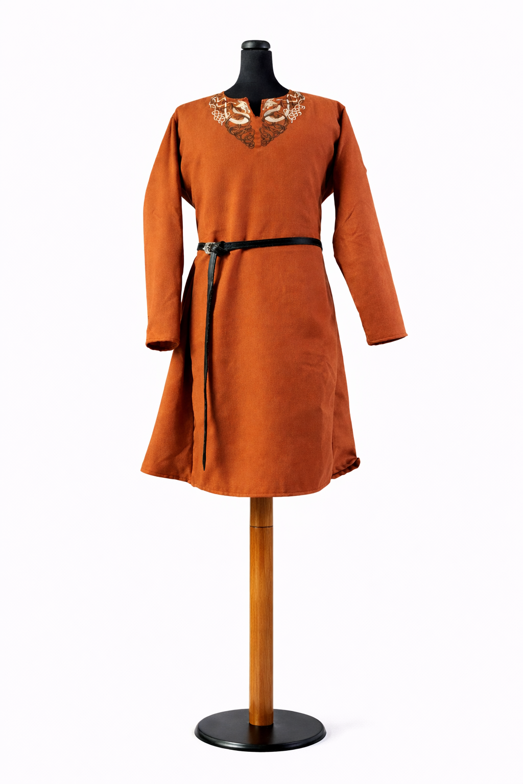 Tunika z vlněné látky v cihlové barvě s výšivkou stylizovaných draků v béžové a hnědé. Látka je spíše tenší.